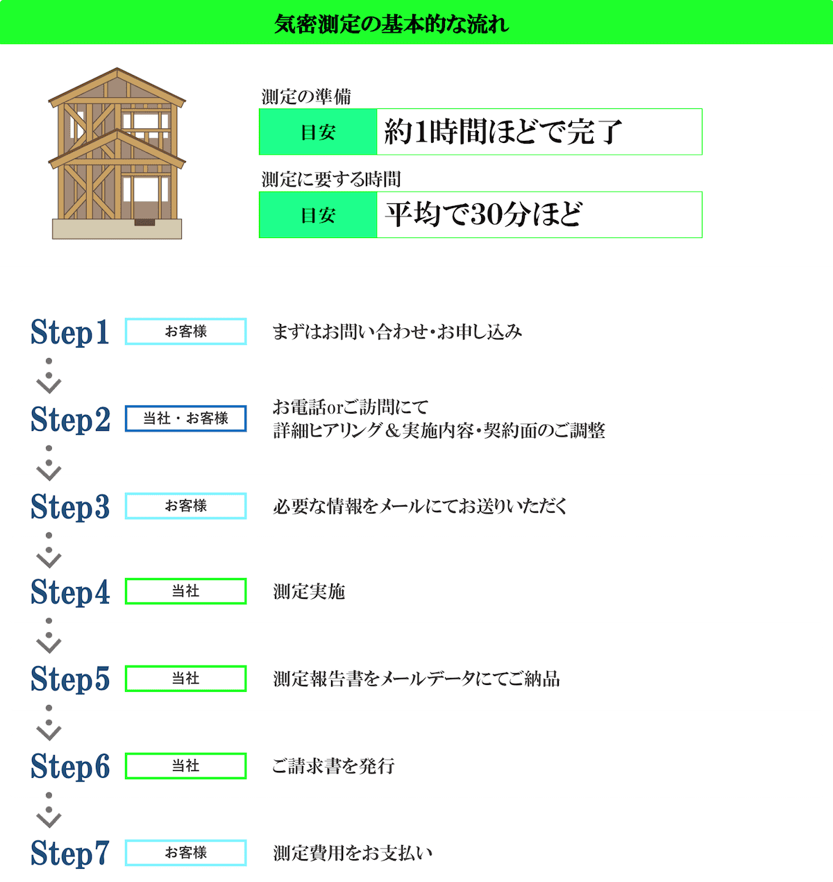気密測定を実施させていただくまでの具体的な流れをこちらのページにまとめました。もしも不明点がございましたら、気兼ねなくご相談ください。
